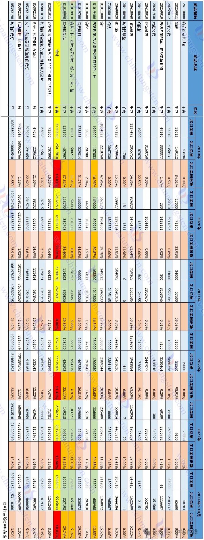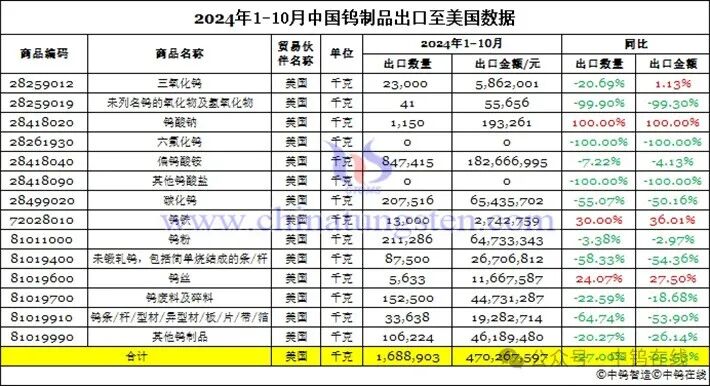 美國對(duì)進(jìn)口中國鎢產(chǎn)品的關(guān)稅將提高到25%公告鎢是一種重要的戰(zhàn)略資源,具有高熔點(diǎn)、高密度、高硬度、高強(qiáng)度、良好的導(dǎo)電導(dǎo)熱性等特點(diǎn),因而廣泛應(yīng)用于軍事、航空航天與電子工業(yè)等領(lǐng)域。在軍事裝備領(lǐng)域,鎢合金具有高硬度、高密度和良好的耐磨性,因此常被用作穿甲彈的彈芯,以穿透敵方裝甲和防御工事。鎢合金是制造槍炮內(nèi)膛及其他關(guān)鍵零部件的優(yōu)選材料,這得益于它卓越的耐磨性和高溫強(qiáng)度,能承受來自高速炮彈的巨大沖擊以及由此產(chǎn)生的高溫高壓環(huán)境。在航空航天領(lǐng)域,鎢的高熔點(diǎn)和高密度特性使其成為航空航天設(shè)備中高溫部件制造的理想材料,例如火箭發(fā)動(dòng)機(jī)的噴嘴、熱燃?xì)夥瓷淦骱腿細(xì)舛娴?,這些部件因需承受極高溫度和壓力,常采用鎢合金或硬質(zhì)合金制造。航空航天設(shè)備中的衛(wèi)星、飛行器等的姿態(tài)控制系統(tǒng)常用鎢合金作為配重塊,以確保設(shè)備的穩(wěn)定性和精度。鎢除了是一種重要的戰(zhàn)略金屬之外,還是一種相對(duì)稀缺的金屬資源。全球鎢礦的分布相對(duì)集中,主要分布在中國、俄羅斯、加拿大等少數(shù)國家。美國地質(zhì)調(diào)查局(USGS)數(shù)據(jù)顯示,2023年全球鎢儲(chǔ)量約440萬噸,其中,中國鎢儲(chǔ)量最高,為230萬噸,占全球總儲(chǔ)量的52.27%。世界鎢供應(yīng)主要來自中國的生產(chǎn)和出口。2023年,全球鎢產(chǎn)量大約78000噸,其中,中國鎢產(chǎn)量最高,為63000噸,占全球總產(chǎn)量的80.77%。2023年全球鎢產(chǎn)量與鎢儲(chǔ)量中國也是美國鎢產(chǎn)品進(jìn)口的重要來源國。據(jù)中鎢在線了解,2024年1-10月我國鎢制品出口到美國的數(shù)量約為1,688.90噸,同比下降27.00%;出口金額為4.7億元,同比下降25.53%。今年1-10月,我國出口到美國的鎢產(chǎn)品有三氧化鎢,未列名鎢的氧化物及氫氧化物,鎢酸鈉,偏鎢酸銨,碳化鎢,鎢鐵,鎢粉,未鍛軋鎢,包括簡(jiǎn)單燒結(jié)成的條/桿,鎢絲,鎢廢料及碎料,鎢條/桿/型材/異型材/板/片/帶/箔,其他鎢制品。其中,鎢酸鈉出口至美國的量為1,150千克,同比增長(zhǎng)100%;鎢鐵為13,000千克,同比增長(zhǎng)30%;鎢絲為5,633千克,同比增長(zhǎng)24.07%。中鎢在線整理近5年中國對(duì)美出口鎢制品數(shù)據(jù)(建議橫盤觀看)鑒于鎢在航空航天和軍事裝備中的廣泛應(yīng)用以及鎢是一種稀缺資源,美國提高對(duì)中國鎢產(chǎn)品的關(guān)稅可能是出于維護(hù)國家安全的考慮。通過減少對(duì)中國鎢產(chǎn)品的依賴,美國可以確保在關(guān)鍵時(shí)刻能夠獲得足夠的鎢資源供應(yīng),以支持其軍事和航空航天產(chǎn)業(yè)的發(fā)展。通過提高關(guān)稅,美國可以鼓勵(lì)其國內(nèi)企業(yè)尋找多元化的供應(yīng)鏈來源,以降低對(duì)中國等單一市場(chǎng)的依賴。據(jù)悉,近期澳大利亞企業(yè)EQ Resources與Elmet Technologies簽訂了一份為期五年的鎢精礦供應(yīng)合同,為美國鎢產(chǎn)品供應(yīng)網(wǎng)絡(luò)注入了新的活力。這些鎢精礦將主要來自EQR位于新南威爾士州的Mt Carbine礦及其在西班牙的Barruecopardo工廠。