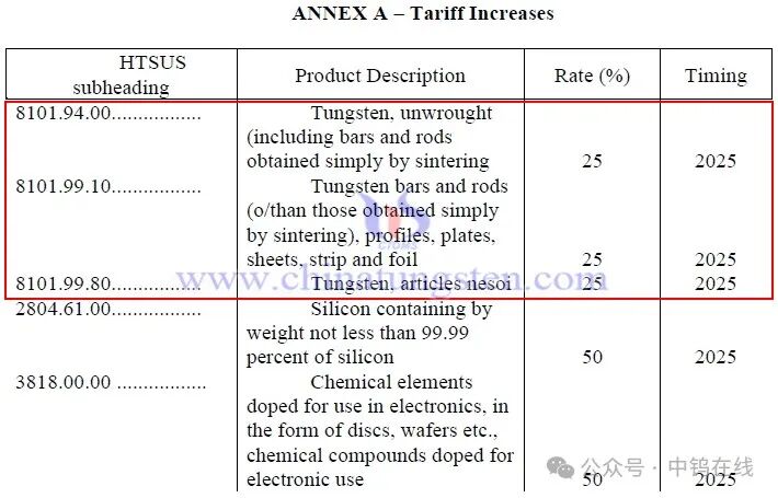 USTR Increases Tariffs Under Section 301 on Tungsten Products, Wafers, and Polysilicon, Concluding the Statutory Four-Year ReviewWASHINGTON – The Office of the United States Trade Representative (USTR) today announced tariff increases under Section 301 for imports from the People’s Republic of China of certain tungsten products, wafers, and polysilicon. The rates for solar wafers and polysilicon will increase to 50 percent, and the rates for certain tungsten products will increase to 25 percent. These tariff increases will take effect on January 1, 2025.“The tariff increases announced today will further blunt the harmful policies and practices by the People’s Republic of China. These actions will complement the domestic investments made under the Biden-Harris Administration to promote a clean energy economy, while increasing the resilience of critical supply chains,” said Ambassador Katherine Tai.The federal notice for today’s announcement can be found here.The tariff increases announced today had been proposed as part of the statutory review of the tariff actions in the Section 301 investigation of the People’s Republic of China’s Acts, Policies, and Practices Related to Technology Transfer, Intellectual Property, and Innovation. These modifications conclude the statutory review. In the USTR Report on the statutory review, the U.S. Trade Representative found that, while the PRC had changed some specific unfair measures, the PRC’s harmful forced technology transfer practices – in particular its cyber theft and industrial espionage – have continued, and in some instances, worsened. The findings of the four-year review can be found on USTR’s website. In light of those findings, Ambassador Tai modified the Section 301 tariff actions by targeting strategic sectors for tariff increases, improving the effectiveness of the tariff actions in achieving the objectives of the investigation, while promoting American jobs and investments. For example, Ambassador Tai increased tariffs (with various effective dates) on electric vehicles, syringes and needles, and medical gloves (100 percent); semiconductors, solar cells, and facemasks (50 percent); and steel and aluminum products, certain critical minerals, and others (25 percent). More details on the specific products, tariff rates, and effective dates can be found on USTR’s website.本文信息由中鎢在線?根據(jù)各方公開的資料和新聞收集編寫,僅為向本公司網(wǎng)站(www.ctia.com.cn,news.chinatungsten.com)、微信公眾號(hào)關(guān)注者提供參考資料。任何異議、侵權(quán)和不當(dāng)問題請(qǐng)向本公眾號(hào)反饋,我們將立即予以處理。未經(jīng)中鎢在線授權(quán),不得全文或部分轉(zhuǎn)載,不得對(duì)文件所載內(nèi)容進(jìn)行使用、披露、分發(fā)或變更;盡管我們努力提供可靠、準(zhǔn)確和完整的信息,但我們無法保證此類信息的準(zhǔn)確性或完整性,本文作者對(duì)任何錯(cuò)誤或遺漏不承擔(dān)任何責(zé)任,亦沒有義務(wù)補(bǔ)充、修訂或更正文中的任何信息;本文中提供的信息僅供參考,不應(yīng)被視為投資說明書、購買或出售任何投資的招攬文件、或作為參與任何特定交易策略的推薦;本文也不得用作任何投資決策的依據(jù),或作為道德、法律依據(jù)或證據(jù)。