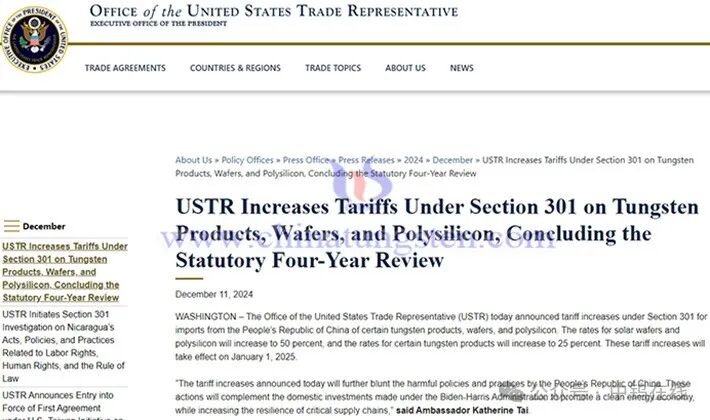 12月11日,美國貿(mào)易代表辦公室發(fā)布聲明稱,經(jīng)過為期四年的審查,美國將根據(jù)“301條款”提高對(duì)自中國進(jìn)口的太陽能芯片、多晶硅和部分鎢產(chǎn)品的進(jìn)口關(guān)稅。芯片和多晶硅的關(guān)稅稅率將從25%提高到50%,而用于制造電子產(chǎn)品和半導(dǎo)體的某些鎢產(chǎn)品的關(guān)稅稅率將提高到25%。關(guān)稅上調(diào)措施將于2025年1月1日生效。